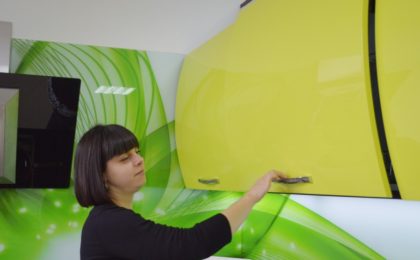 Кухонный гарнитур со стеклянными фасадами считают экологически чистыми, поскольку стекло изготавливается из песка со специальными добавками, совсем нетоксичными.
